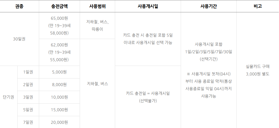 이용범위: 서울지역 지하철 + 김포골드라인, 서울시 면허 시내·마을버스, 따릉이 - 이용제외: 신분당선, 서울지역 외 지하철, 광역/공항버스, 타 지역 면허버스