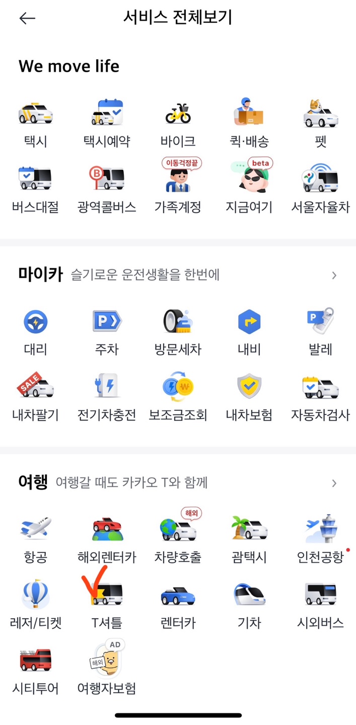 메인 홈에서 전체보기를 누른 후 아래쪽에 T셔틀을 누르면
